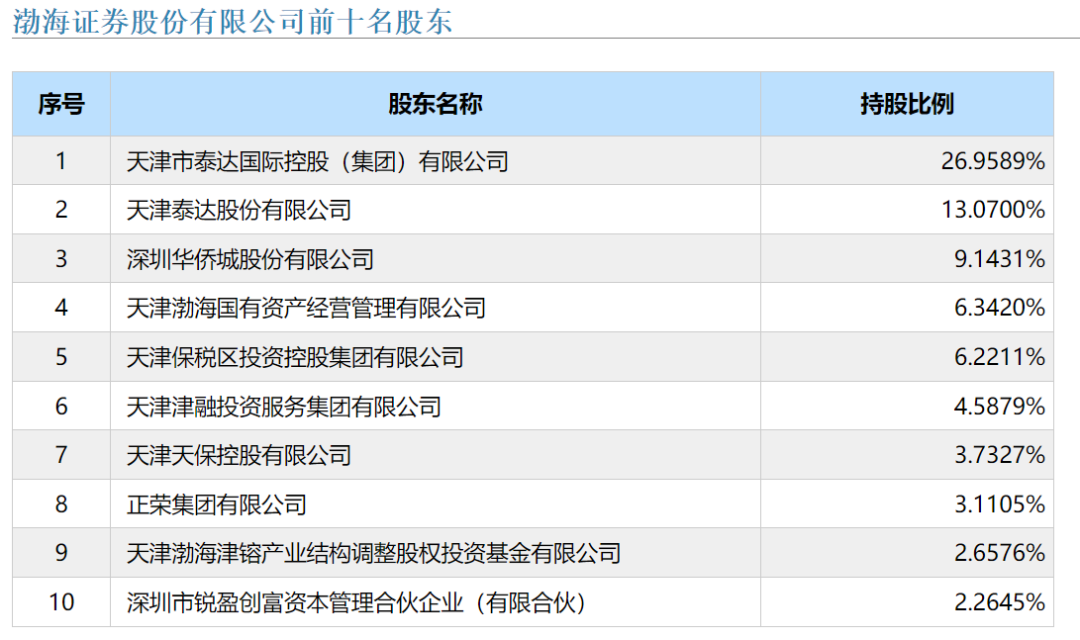 官网信息显示,渤海证券成立于2001年,天津市泰达国际控股(集团)有限公司(简称“泰达国际”)为公司控股股东。天津市国资委为公司实际控制人。目前,公司股东43家,前五大股东分别为天津市泰达国际控股(集团)有限公司、天津泰达股份有限公司、深圳华侨城股份有限公司、天津渤海国有资产经营管理有限公司、天津保税区投资控股集团有限公司。